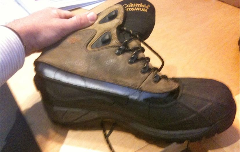 The test subject was a pair of Columbia Titanium boots that had completely delaminated on me during a November duck hunt in Washington State. I sent the boots with the following note to Gert.