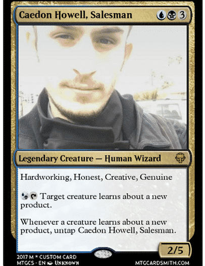 As is portrayed, Caed is a Magic: The Gathering master. He created his resume brilliantly by going to MTGCardSmith.com, where you can build your own magic cards. But in this case, Caed conjured his story.